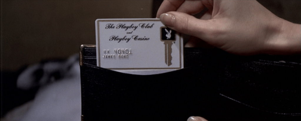 Tiffany Chase pulling James Bond’s Playboy Club and Casino Membership card from his wallet.