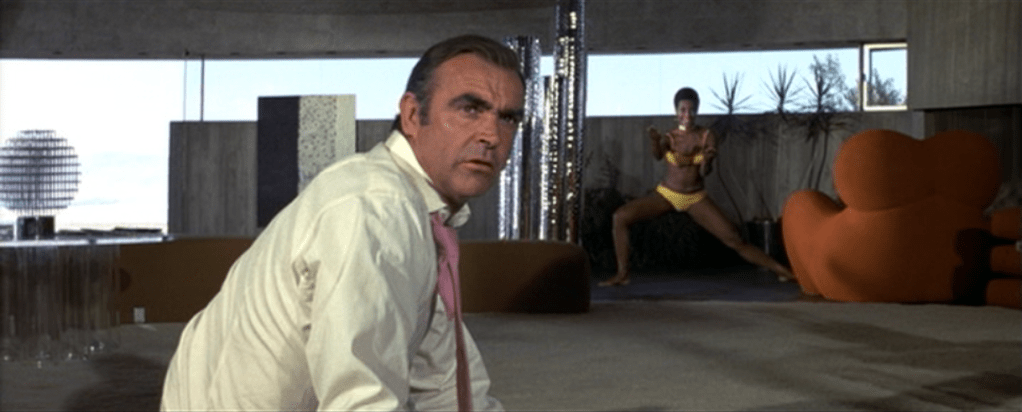 Thumper lunging in preparation to strike James Bond during fight in the living room of John Lautner’s Elrod House.