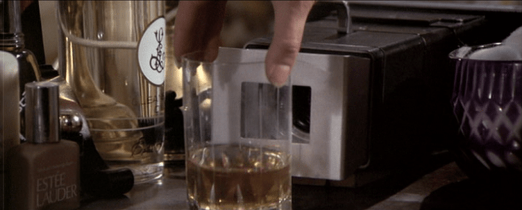 Tiffany Chase using a hidden camera on her vanity to capture James Bond’s fingerprint.