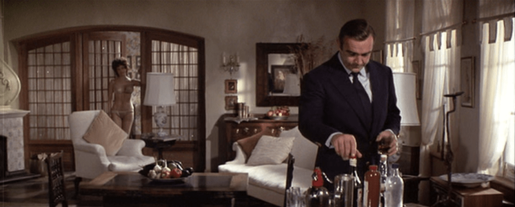 Tiffany Chase re-emerges from her bedroom, only wearing her undergarments, as James Bond continues to pour himself a drink. Tiffany is framed by the doorway into her bedroom.