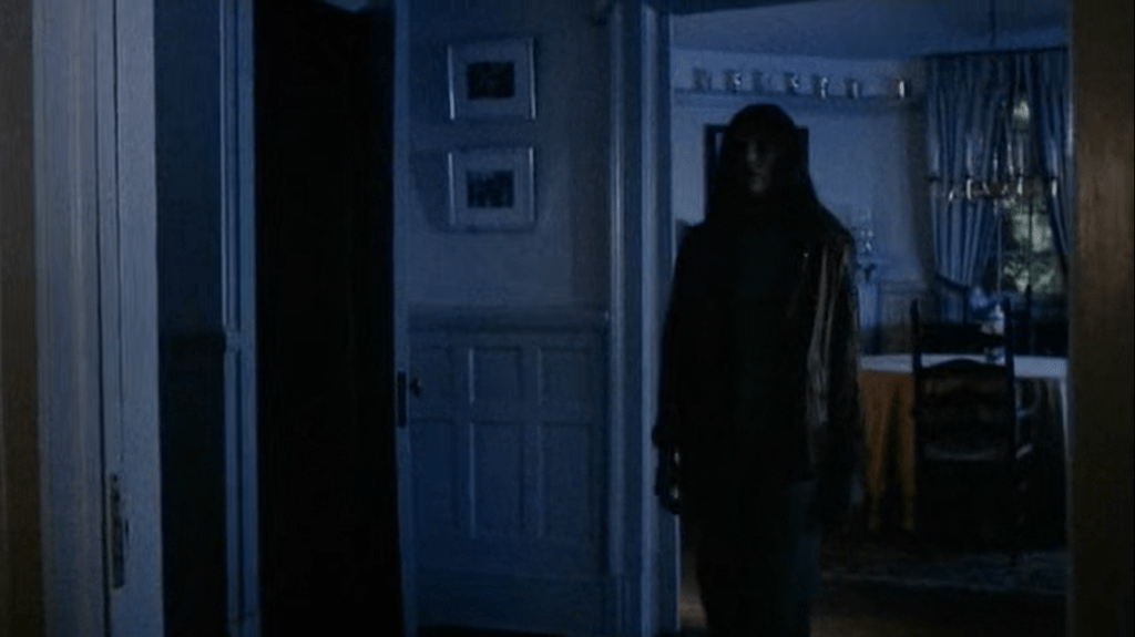 After returning from therapy, Joanna returns home to a dark house; she is framed by the threshold to the dining room of the home. The darkness of her otherwise bright, white home foreshadows her imminent replacement by Robot Joanna and symbolizes her deep unhappiness and uneasiness in Stepford/suburbia.