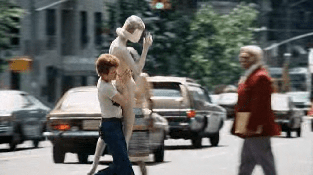 Joanna watches a man carrying a female mannequin across the street in New York CIty.