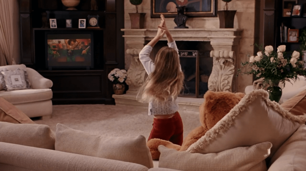 Regina’s younger sister dancing provocatively while watching a music video in the living room of the George’s mansion.