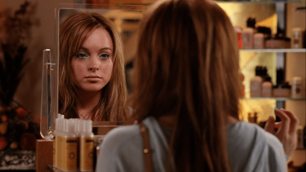 Cady staring at herself in a mirror while visiting Janis at work.