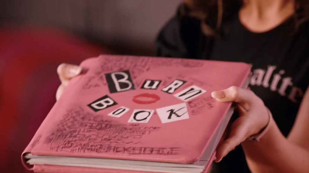 Presentation of the Burn Book to Cady; the Book is filled with misogynistic statements about the Plastics’ classmates, mostly other women. The contents of the Book align with what bell hooks describes as ‘white woman feminism,’ a form of patriarchal feminism which supports and encourages competition across women rather than solidarity and refuses to acknowledge white women’s role in the systemic oppression of women and people of color.