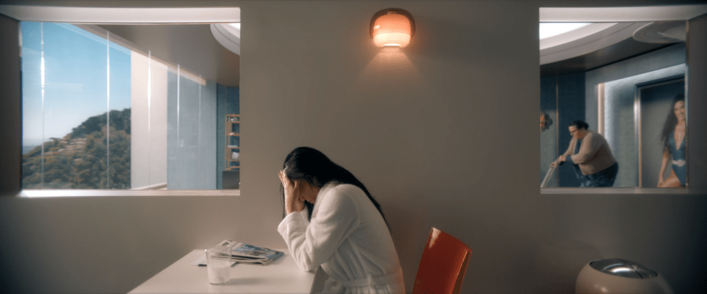 2020s, chairs, commodification, confinement, dining tables, double framing, Elisabeth Sparkle/Sue’s Apartment, kitchen, living room, objectification, photographs, stills, The Substance, windows