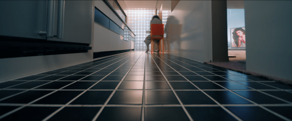 2020s, billboards, carpeting, chairs, commodification, confinement, countertops, dining tables, doorways, double framing, Elisabeth Sparkle/Sue’s Apartment, glass block, kitchen, kitchen appliances, kitchen cabinets, living room, objectification, stills, The Substance, tile, windows