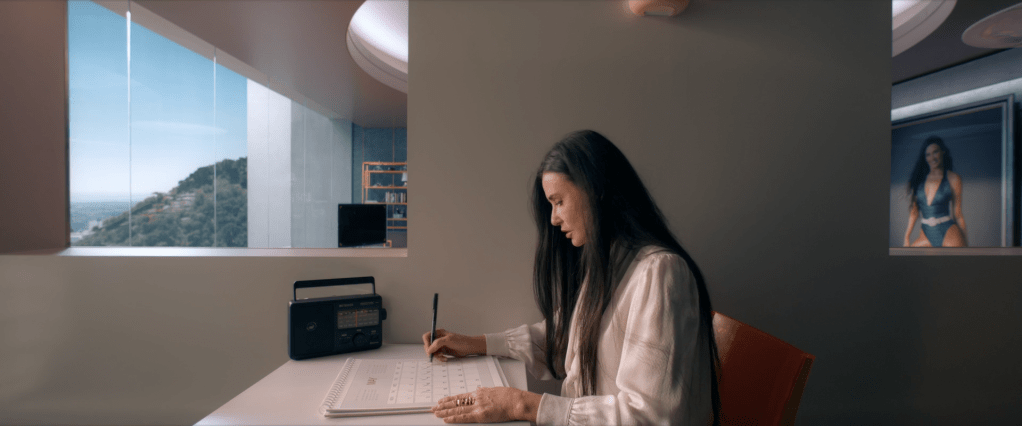 2020s, bookshelves, chairs, commodification, confinement, dining tables, double framing, Elisabeth Sparkle/Sue’s Apartment, kitchen, living room, objectification, photographs, stills, The Substance, windows