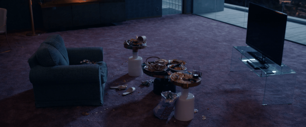 2020s, carpeting, chairs, coffee tables, confinement, doorways, Elisabeth Sparkle/Sue’s Apartment, glass block, living room, objectification, side tables, stills, televisions, The Substance, windows