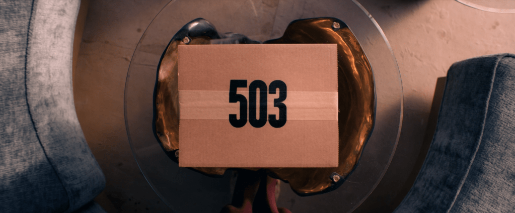 Elisabeth recieves her first dose of The Substance; a box displaying her patient number, ‘503,’ rests on the coffee table in her living room.