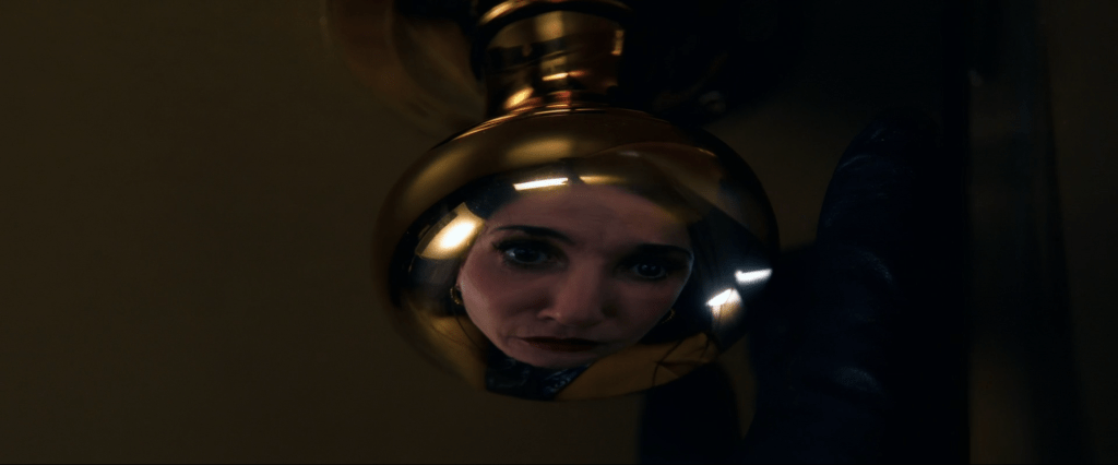 Elisabeth looks at her reflection in a doorknob while debating if she should venture into the outside world.