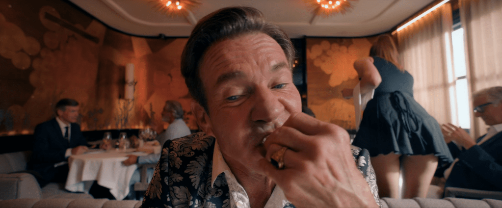 Harvey messily eating prawns at Elisabeth’s birthday lunch; a young waitress is seen in the distance bending over.