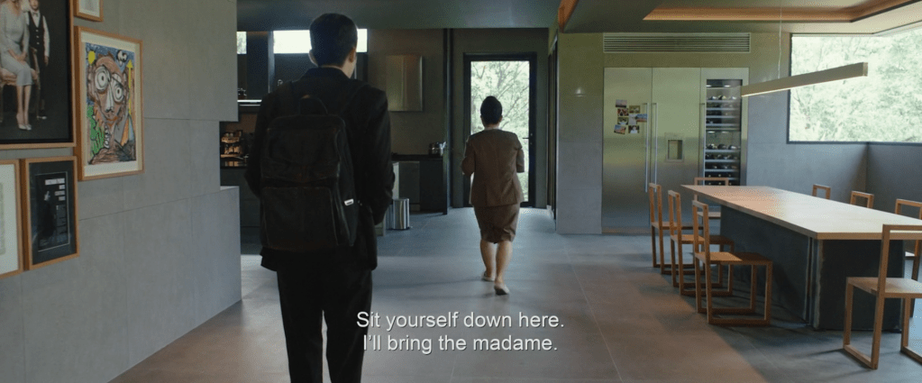 2010s, chairs, chandeliers, commodification, confinement, countertops, dining tables, doorways, double framing, foyer, hallways, kitchen, kitchen appliances, kitchen cabinets, objectification, paintings, Parasite, Park Family Mansion, photographs, Seongbuk-dong Seoul, South Korea, solid walls, stills, windows