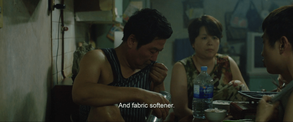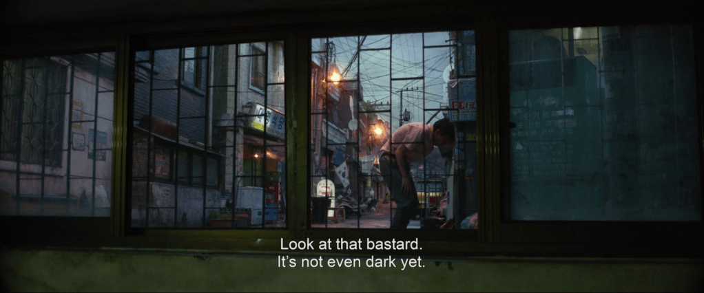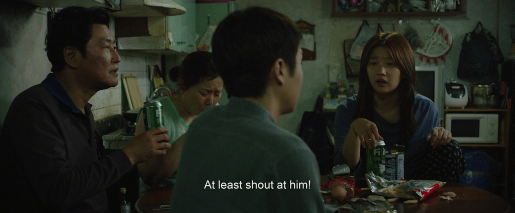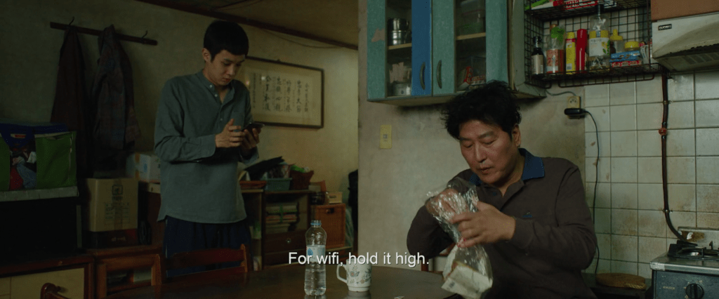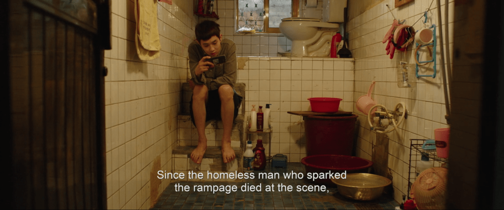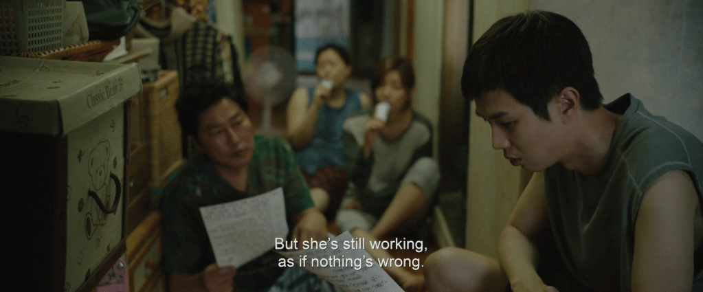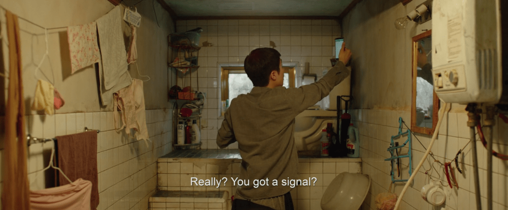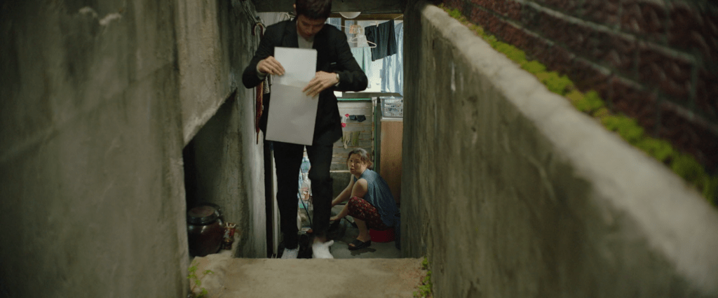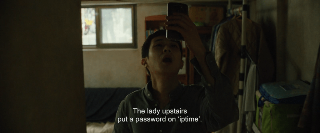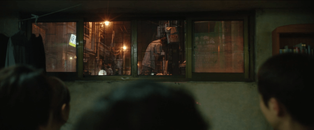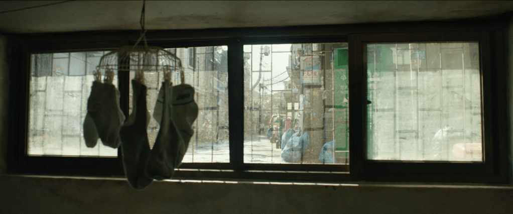 multiple screen layers comprise the window unit—the window panes, a tattered bug screen, and a metal security grate, further restricting the Kims’ view out of their apartment. Symbolically, this restricted view represents the inaccessible version of Seoul the Kims are barred from because of their economic background. The poverty they face firmly places them below ground, always looking up at a partial image of a ‘better’ life. Ki-taek is framed behind these screens at the beginning of the film, visually imprisoning him within his home and the impoverished conditions he lives under. The downwards angle of this still recreates the perspective of an outsider, looking down on Ki-taek, the Kims, and their living conditions. The camera and its framing of Ki-taek situates audience members as other residents of Seoul, viewing the economic struggle of the Kims with contempt and an air of superiority; after all, we as the audience are physically placed above the Kims in this scene.