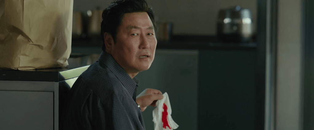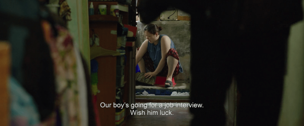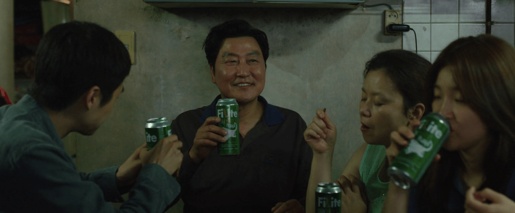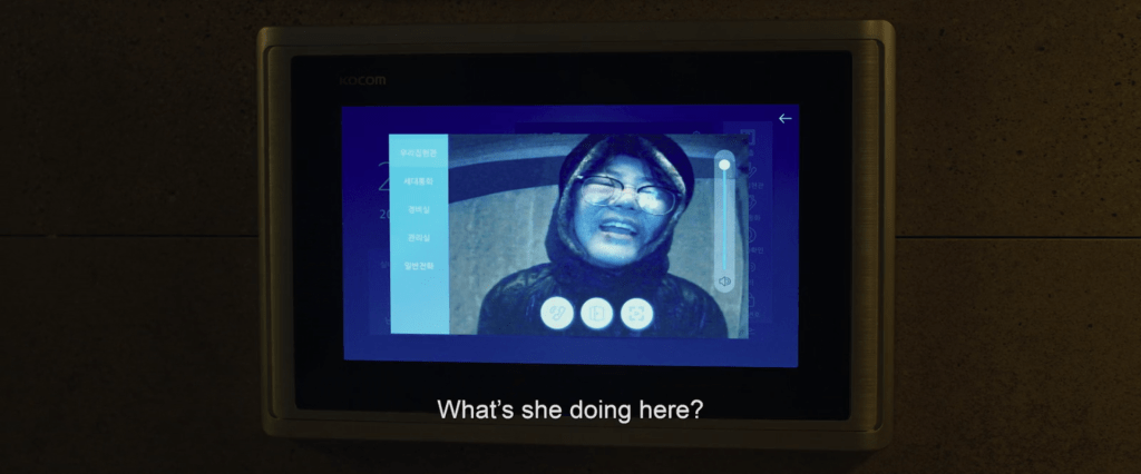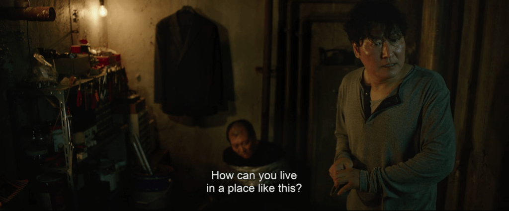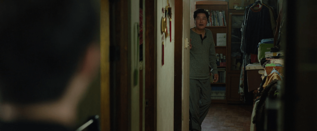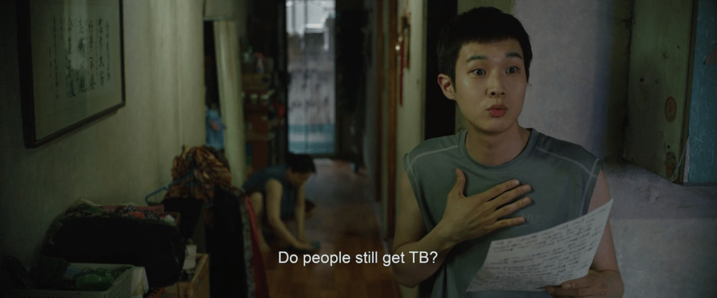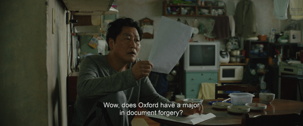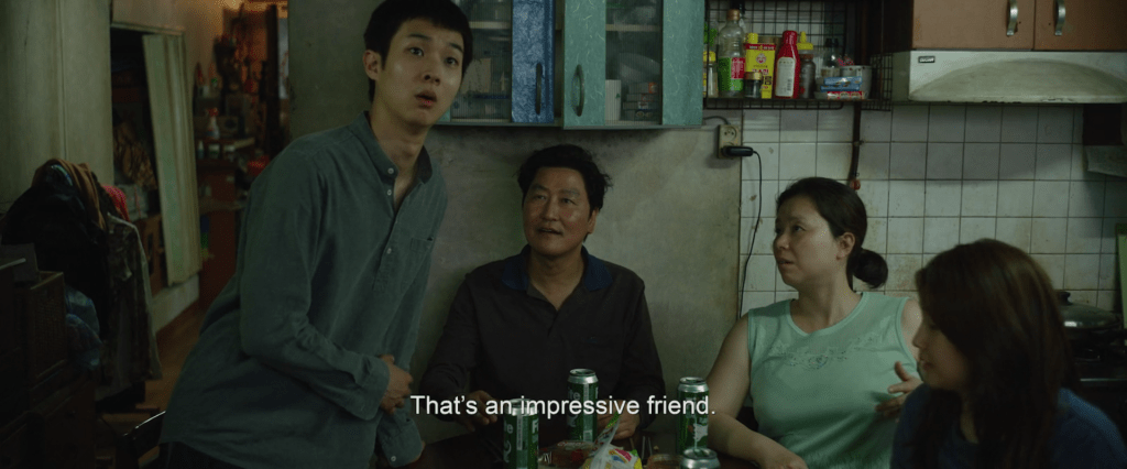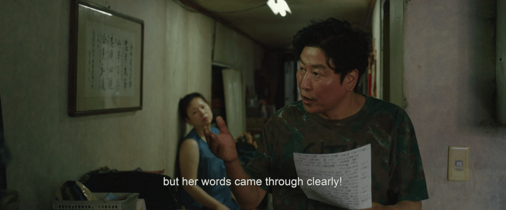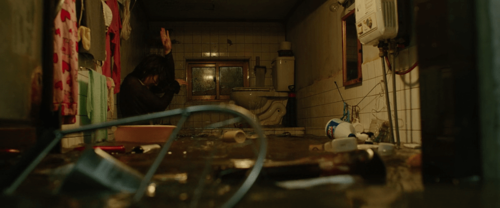 multiple screen layers comprise the window unit—the window panes, a tattered bug screen, and a metal security grate, further restricting the Kims’ view out of their apartment. Symbolically, this restricted view represents the inaccessible version of Seoul the Kims are barred from because of their economic background. The poverty they face firmly places them below ground, always looking up at a partial image of a ‘better’ life. Ki-taek is framed behind these screens at the beginning of the film, visually imprisoning him within his home and the impoverished conditions he lives under. The downwards angle of this still recreates the perspective of an outsider, looking down on Ki-taek, the Kims, and their living conditions. The camera and its framing of Ki-taek situates audience members as other residents of Seoul, viewing the economic struggle of the Kims with contempt and an air of superiority; after all, we as the audience are physically placed above the Kims in this scene.