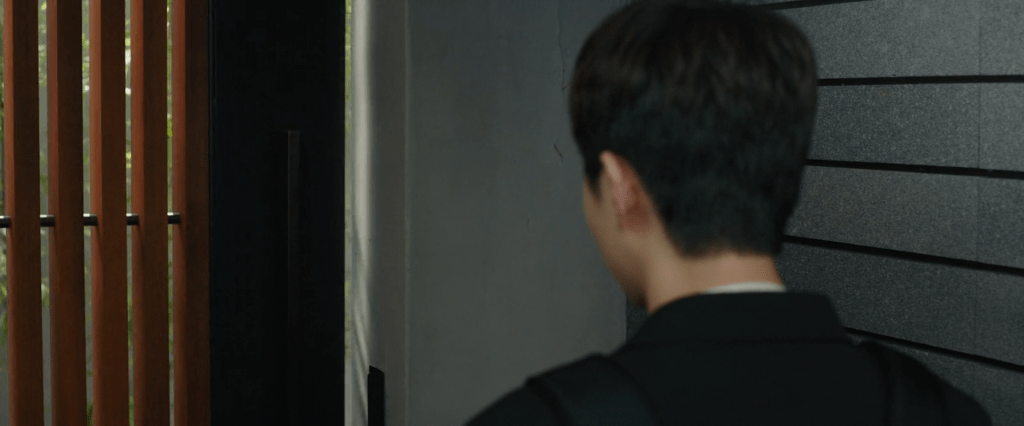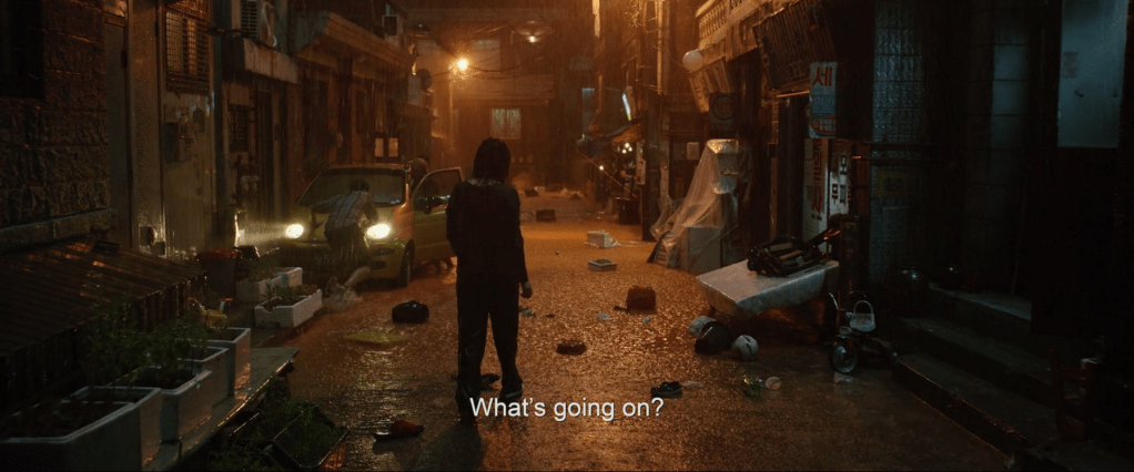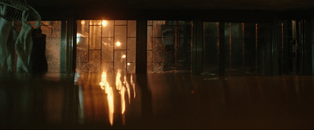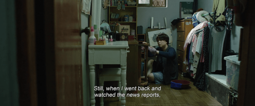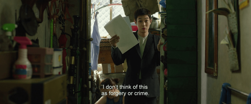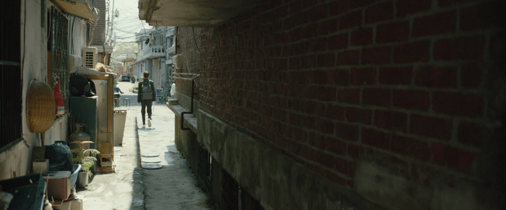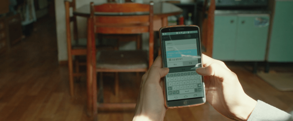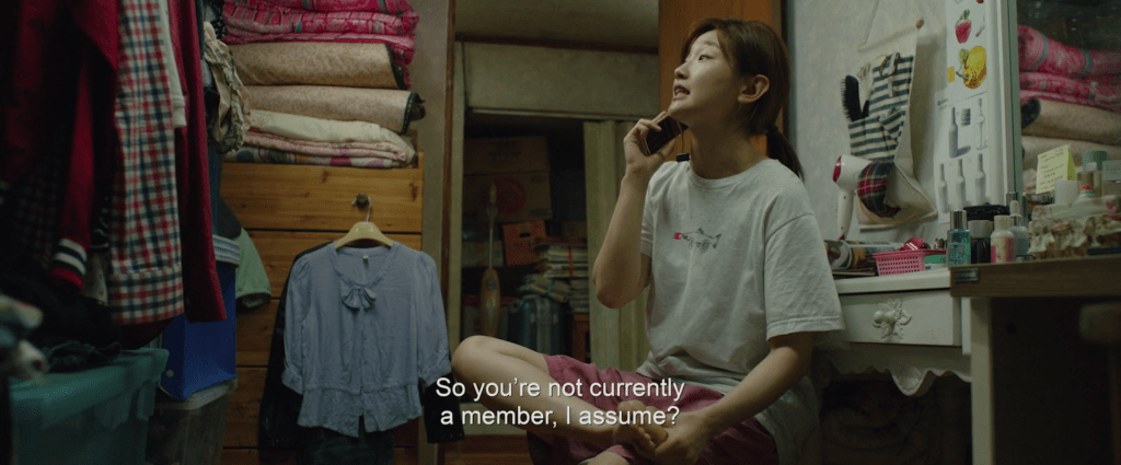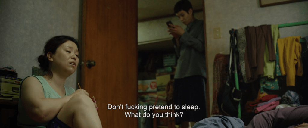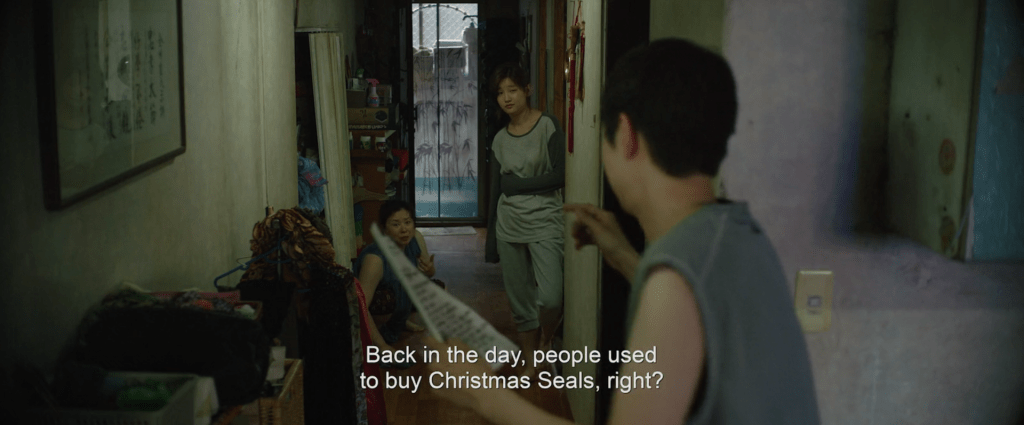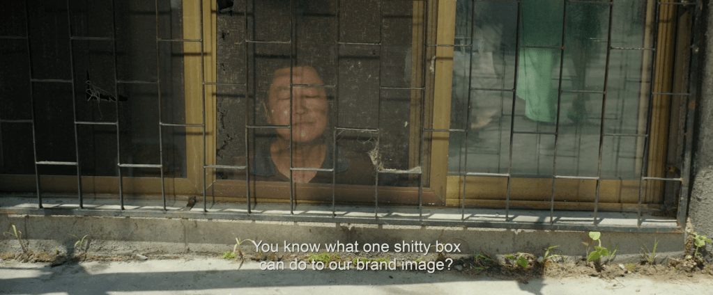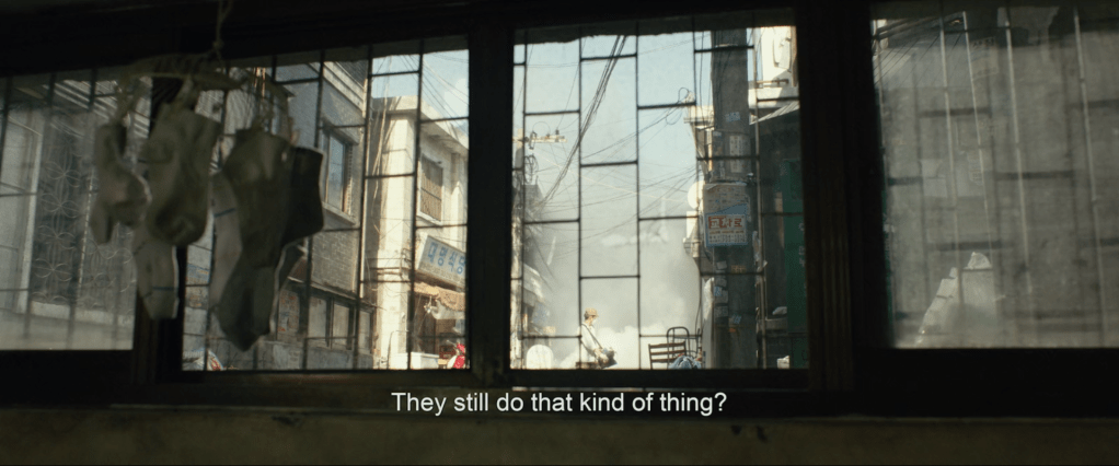 multiple screen layers comprise the window unit—the window panes, a tattered bug screen, and a metal security grate, further restricting the Kims’ view out of their apartment. Symbolically, this restricted view represents the inaccessible version of Seoul the Kims are barred from because of their economic background. The poverty they face firmly places them below ground, always looking up at a partial image of a ‘better’ life. Ki-taek is framed behind these screens at the beginning of the film, visually imprisoning him within his home and the impoverished conditions he lives under. The downwards angle of this still recreates the perspective of an outsider, looking down on Ki-taek, the Kims, and their living conditions. The camera and its framing of Ki-taek situates audience members as other residents of Seoul, viewing the economic struggle of the Kims with contempt and an air of superiority; after all, we as the audience are physically placed above the Kims in this scene.