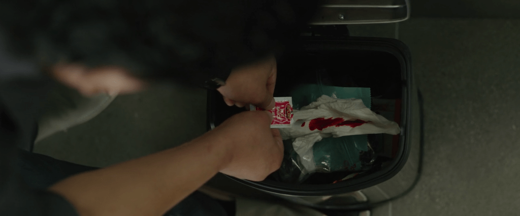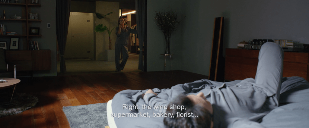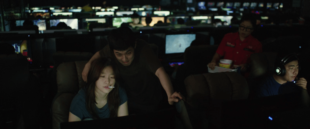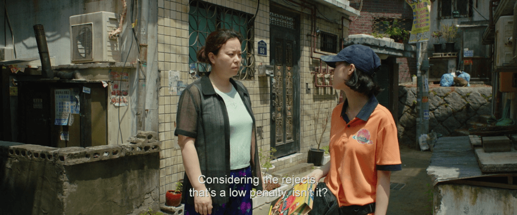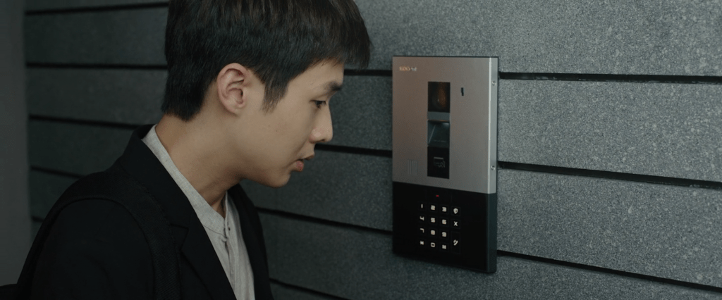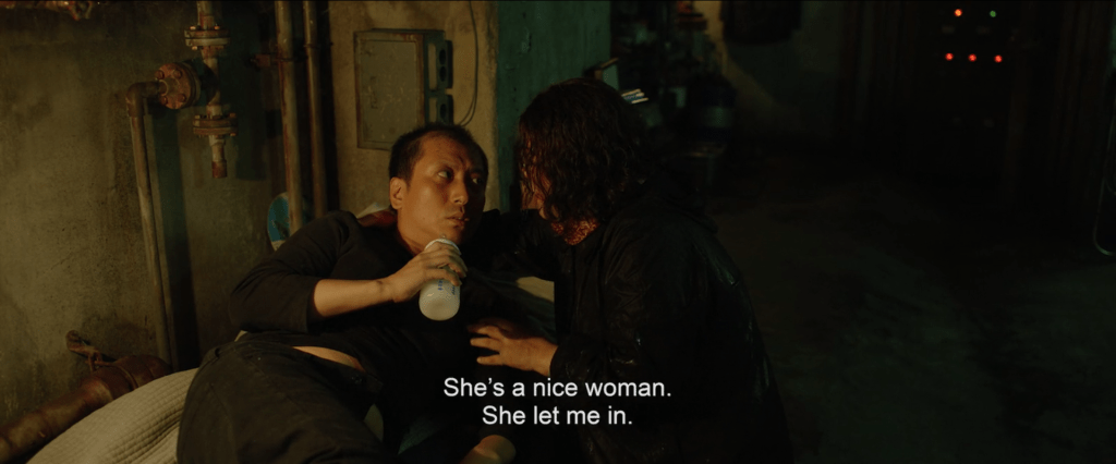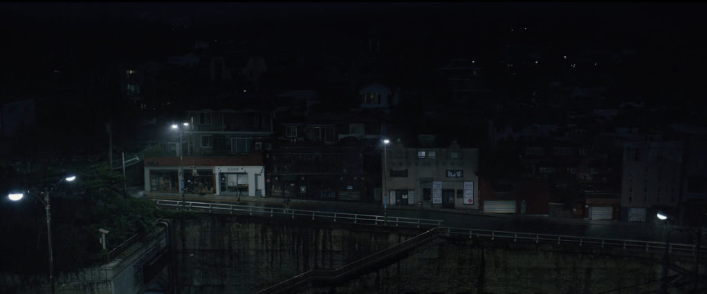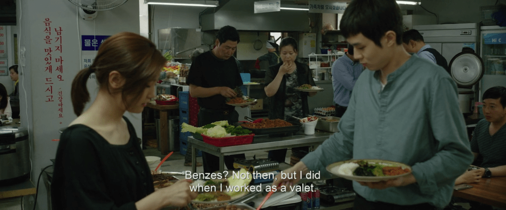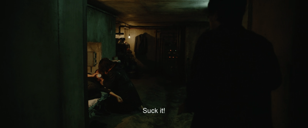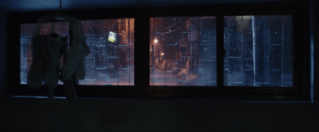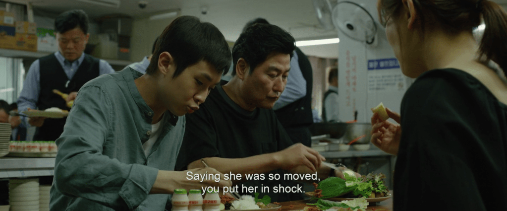 multiple screen layers comprise the window unit—the window panes, a tattered bug screen, and a metal security grate, further restricting the Kims’ view out of their apartment. Symbolically, this restricted view represents the inaccessible version of Seoul the Kims are barred from because of their economic background. The poverty they face firmly places them below ground, always looking up at a partial image of a ‘better’ life. Ki-taek is framed behind these screens at the beginning of the film, visually imprisoning him within his home and the impoverished conditions he lives under. The downwards angle of this still recreates the perspective of an outsider, looking down on Ki-taek, the Kims, and their living conditions. The camera and its framing of Ki-taek situates audience members as other residents of Seoul, viewing the economic struggle of the Kims with contempt and an air of superiority; after all, we as the audience are physically placed above the Kims in this scene.