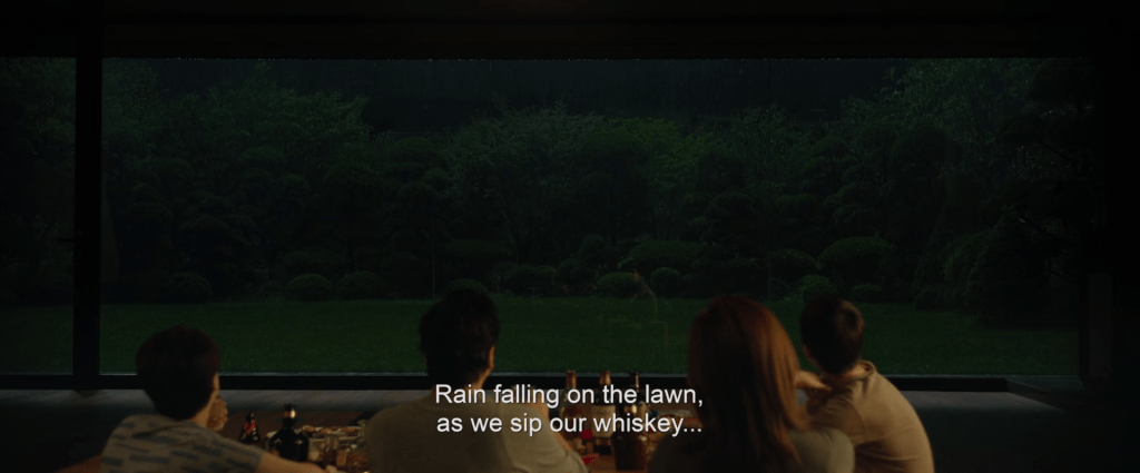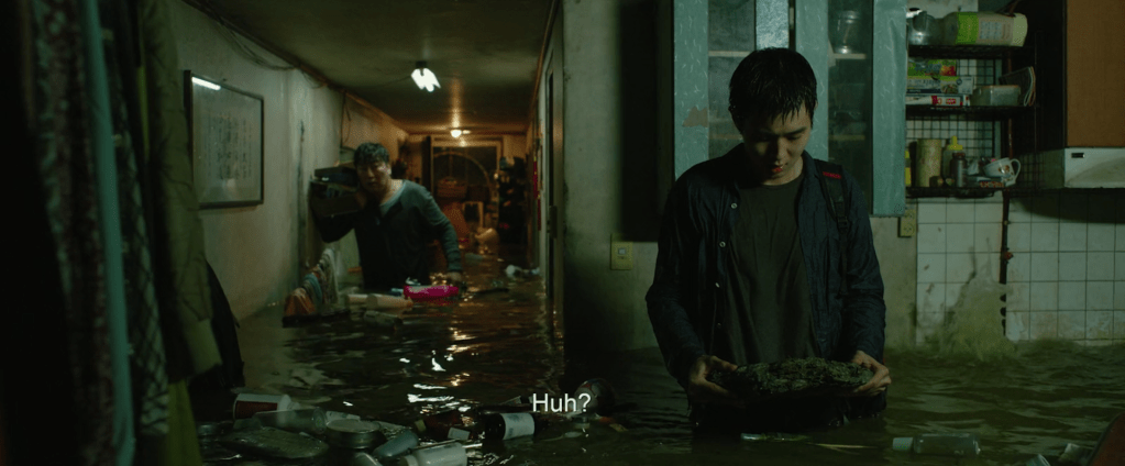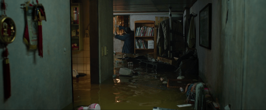 The Parks call the house, telling Chung-sook to start preparing dinner because the camping trip was cancelled due to a severe rainstorm. While Chung-sook frantically cooks, Ki-woo, Ki-jung, and Ki-taek destroy all evidence of their struggle with Moon-gwang and her husband, locking them in the bunker. Chung-sook serves dinner while her family hides under a table in the living room, later overhearing Mr. Park belittling Ki-taek’s scent which he links to the impoverished area the Kims are from. Ki-woo, Ki-jung, and Ki-taek eventually flee from the Parks’ mansion, but return home to their banjiha flooded with sewage water because of the rainstorm.