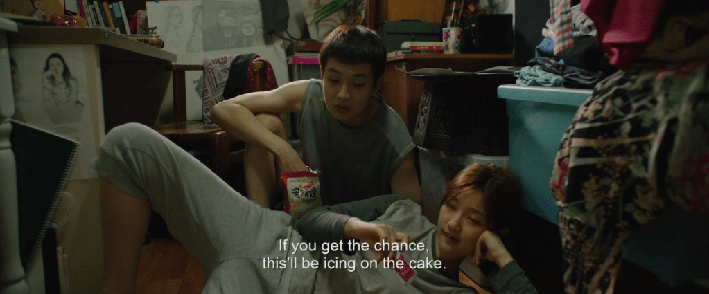 Parasite revolves around two families from Seoul, South Korea—the Kims and the Parks—and their reciprocal parasitic relationship. The Kim Family hails from Aheyon-dong, an impoverished and densely populated neighborhood in Seoul; they live in a banjiha, a semi-basement apartment that is a common housing typology in the area. As the Kims face job insecurity, the son of the Kim family, Ki-woo, is encouraged by his friend Min to take over his job as an English tutor for the daughter of the wealthy Park family by falsifying his educational records. Ki-woo, with the help of his sister Ki-jung, forges a transcript from the prestigious Yonsei University and secures the job.