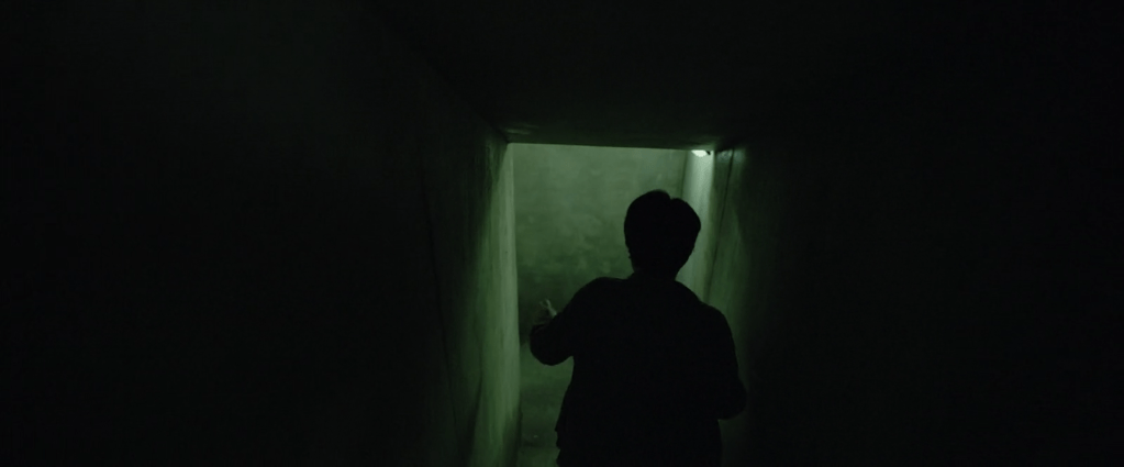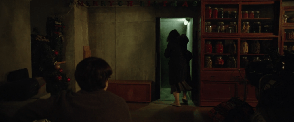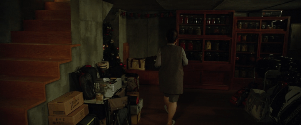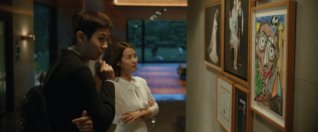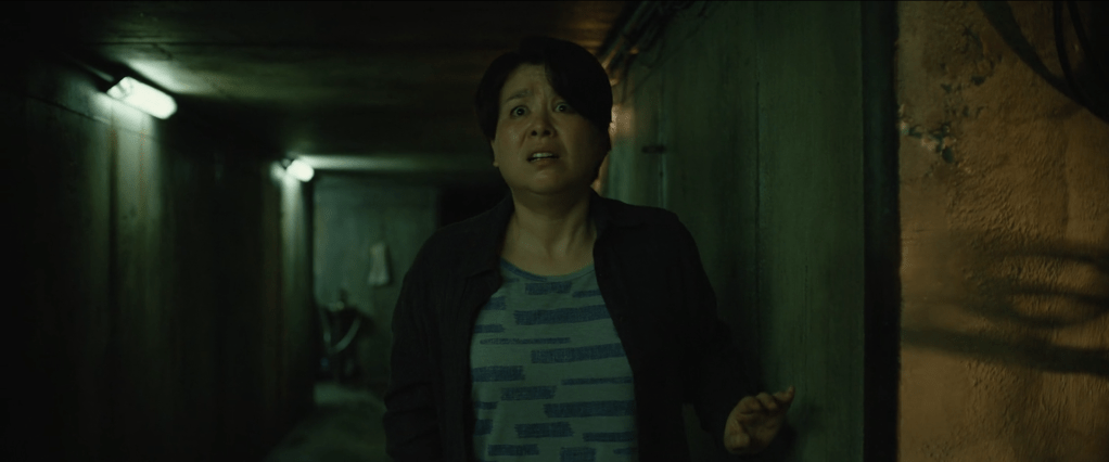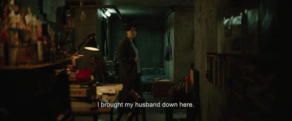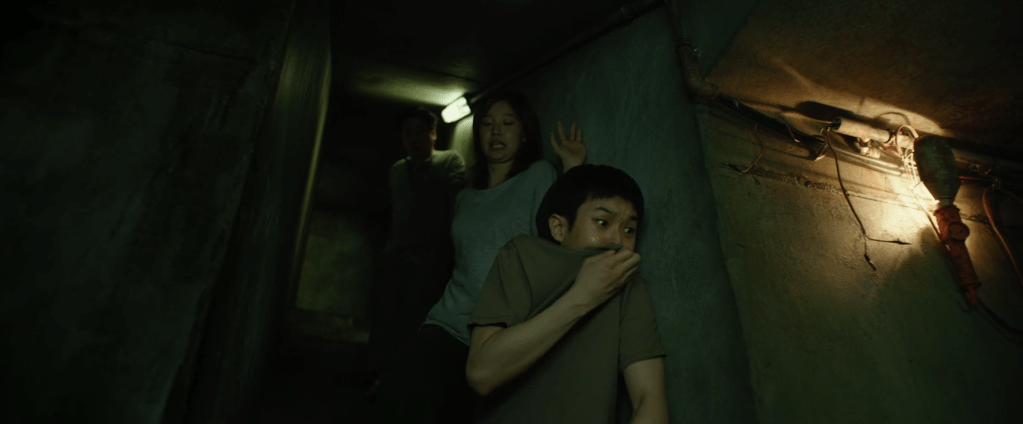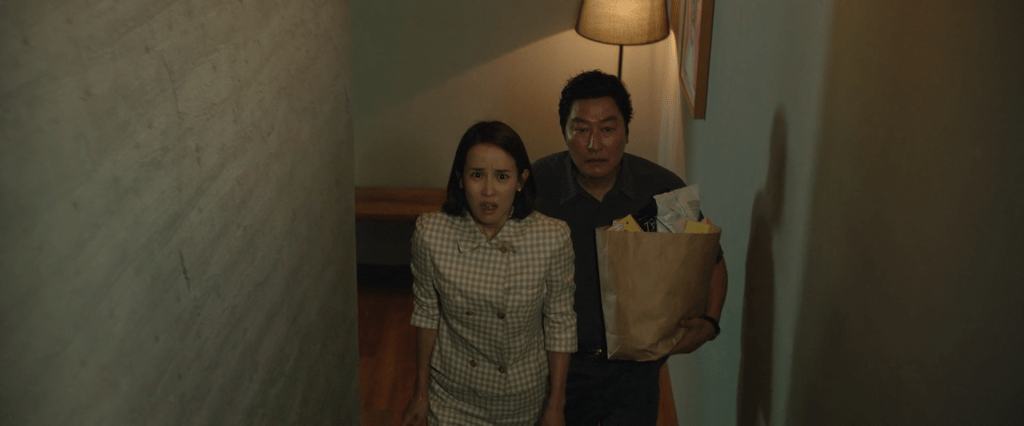 The Kim Family captures a glimpse of the posh lifestyles of the Parks’ while the family is away on a camping trip for Da-song’s birthday, enjoying the lavish amenities their employers are accustomed to. The Kims’ weekend of opulent relaxation is interrupted when Moon-gwang unexpectedly visits the Parks’ mansion claiming to have forgotten something in the basement. Moon-gwang immediately runs to the basement pantry to reveal the entrance to a secret bunker built by the architect and former owner of the home. Her husband, Geun-sae has been living in the bunker for the duration of Moon-gwang’s employment to the Park Family to hide from debt collectors; he was the ‘ghost’ seen by Da-song, leaving the bunker to steal food from the upper areas of the house. Moon-gwang tries to make a deal with Chung-sook to allow her husband to stay in the bunker, but the rest of the Kim Family tumbles into the bunker, revealing their secret familial connection, while eavesdropping on the negotiations. Moon-gwang and her husband instead decide to blackmail the Kim Family by threatening to reveal their duplicity to the Parks.