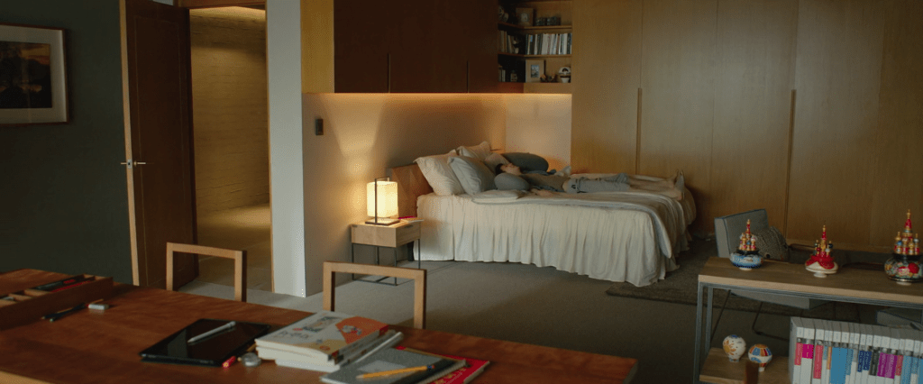 Chung-sook, the matriarch of the Kim family, in particular is unable to break free of domestic labor responsibilities; the framing of her body within a compressed doorway makes this restraint architectural. During the film, Chung-sook is seen cleaning a rock, framed within the entry threshold and corridor of the family’s banjiha. Even though she is at home, she is unable to escape domestic labor; Chung-sook is still expected to cook and clean for her family because of her role as a mother despite the fact that she is also employed as a housekeeper for the Parks to provide for her family economically. Furthermore, the space dedicated to Chung-sook’s housework at home is minimal at best (in this instance needing to leave the bounds of the apartment to clean the rock properly), again emphasizing the architecturally restrictive nature of domestic labor required of women and people in more ‘feminine’ lines of work.