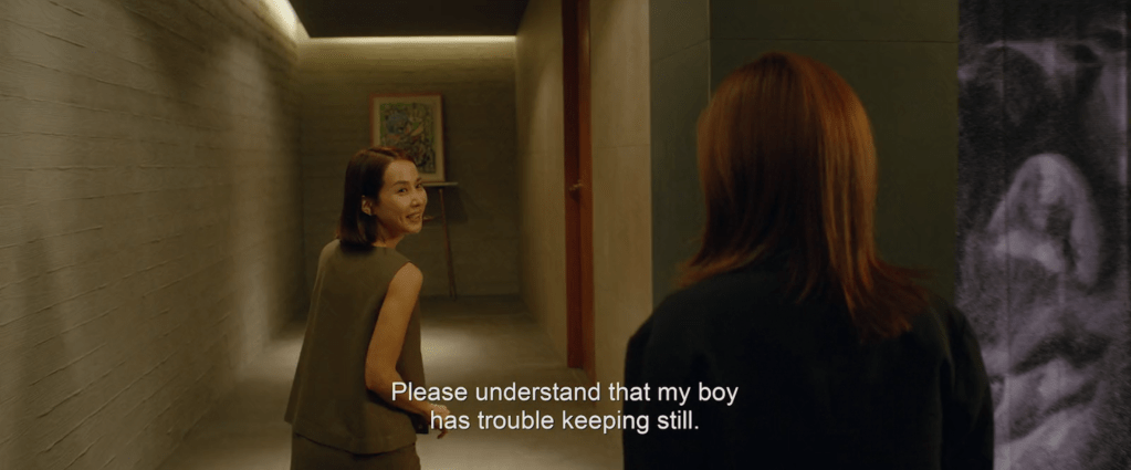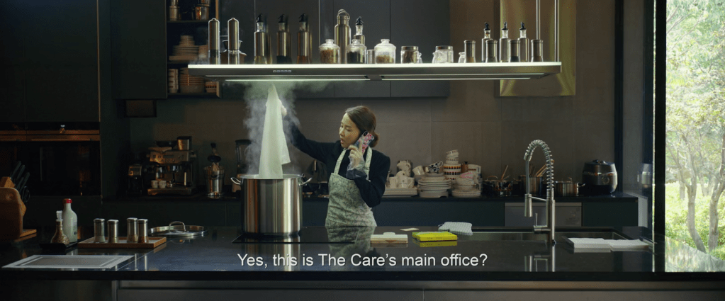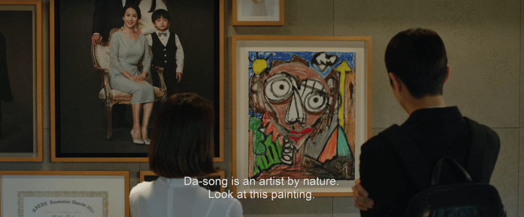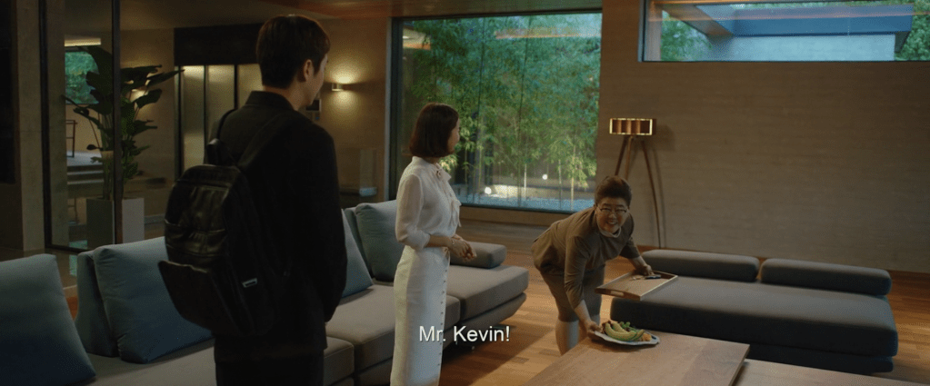The Park Family lives in Seongbuk-dong, an incredibly wealthy neighborhood in Seoul. When Ki-woo visits the Parks for his job interview, he learns of the naivety of Park Yeon-gyo, the mother of the family, and devises a plan to find jobs for all of his family members as domestic servants of the Parks. Ki-jung is hired as an ‘art therapist’ for the Parks’ son Da-song, who has been traumatized after seeing a ‘ghost’ in the kitchen on his birthday the year prior. Ki-woo and Ki-jung work in tandem to frame Mr. Park’s driver as a pervert and Moon-gwang, the Parks’ housekeeper, as secretly suffering from tuberculosis to open new positions for their parents to find employment within the Parks’ home. In this moment, the Kims and the Parks are both parasites; the Kims secretly invading the home of and relying on the Parks for financial stability and the Parks leeching off the domestic labor provided by the Kims to account for their own inability to take care of themselves.