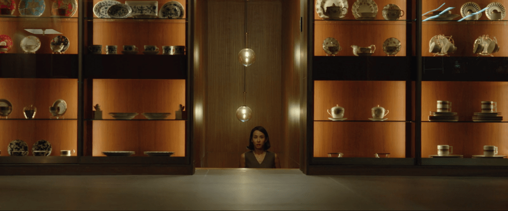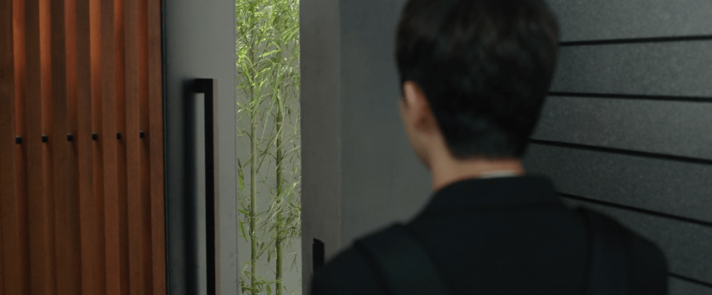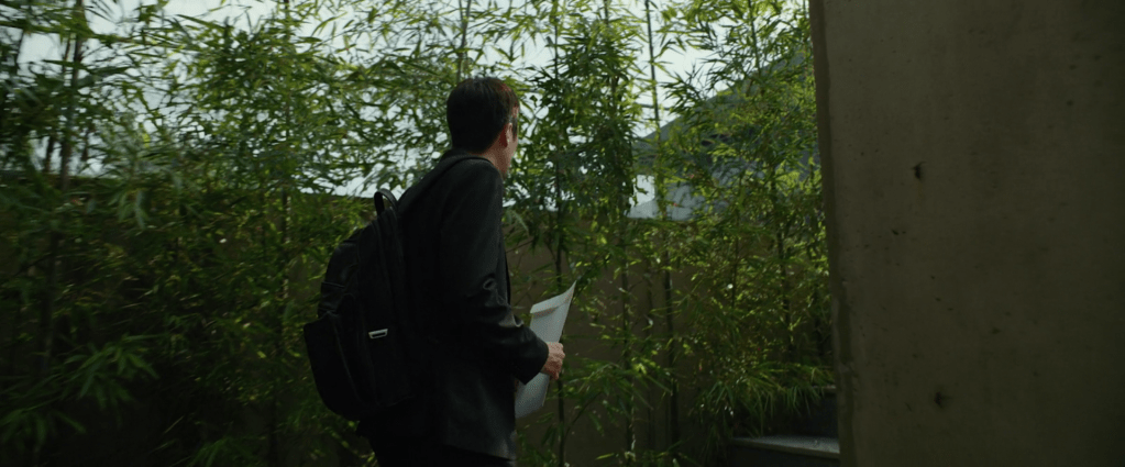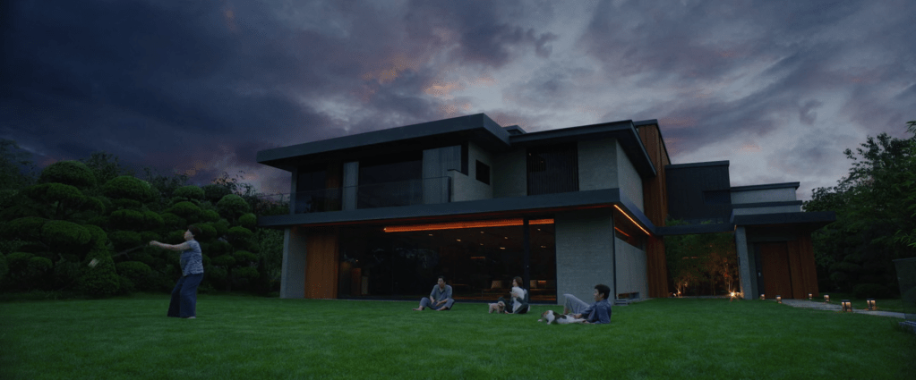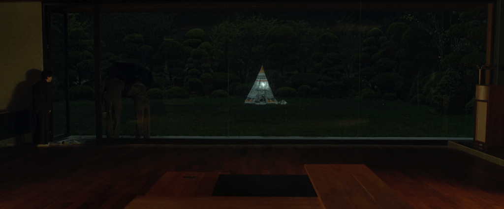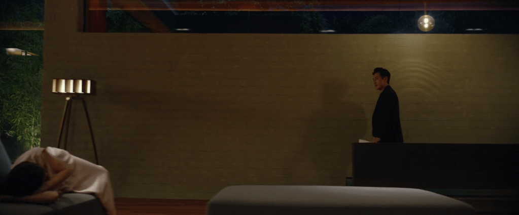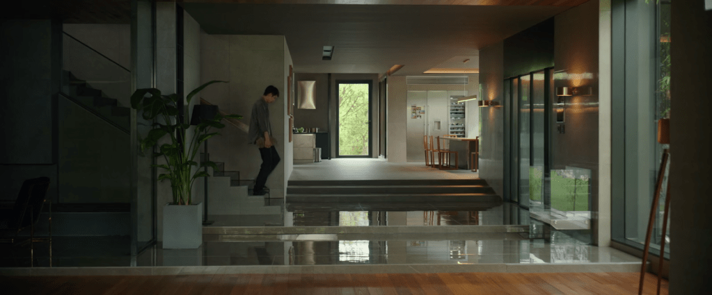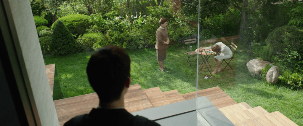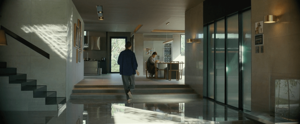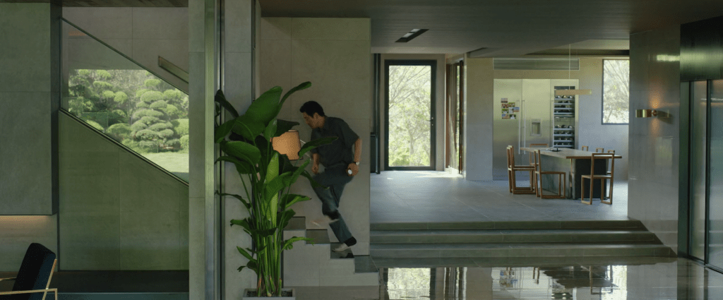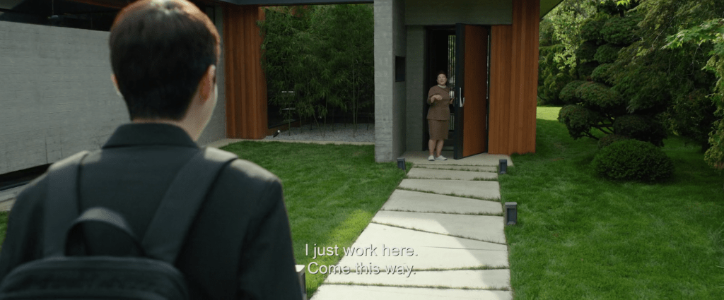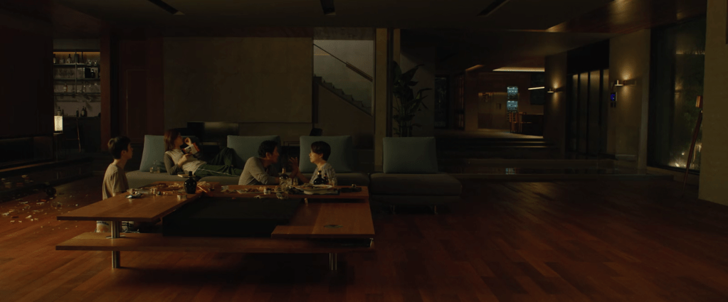 The window which frames and imprisons Ki-taek and his family directly juxtaposes a window in the home of the Parks. While the screens and obstructed views in and out of the Kims’ window architecturally represents their entrapment within a system of patriarchal capitalism which devalues household labor and service industry jobs because they are women-dominated fields. The large horizontal window in the living room of the Parks’ modernist, concrete compound is unobstructed, framing a perfect landscape planted within their backyard. Each window in Parasite frames a view into the outside world, but the Kims’ window depicts a real, ever-changing view of their environment, while the Park’s window frames an artificial landscape which shields them from the city they live in. The juxtaposition of the views framed in these windows, despite their similar shapes, highlights Parasite’s commentary upon the blindness of the wealthy class to the circumstances of the working-class world around them, even as they welcome working-class individuals into their home to aid in the education of their children and daily household chores, relieving the wealthy of their domestic duties while adding more labor responsibility into the lives of the impoverished Kim family. No matter which domestic space the Kim family occupies, they are unable to escape the constriction and exploitation of domestic labor, caged in by their own apartment. Conversely, the Parks’ access to capital allows for them to lead indolent and ignorant lives, unaware of the privilege they hold in relation to the conditions of the reality of the world outside of their home.