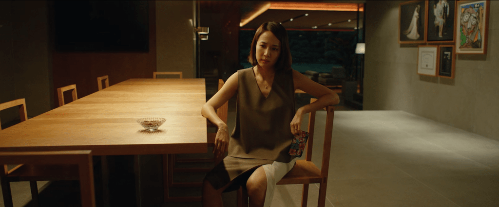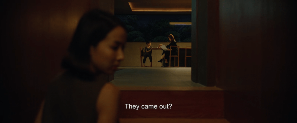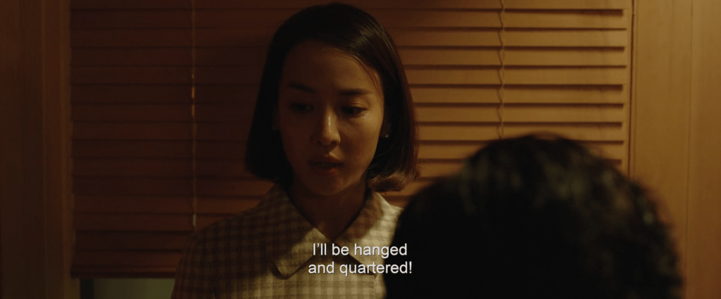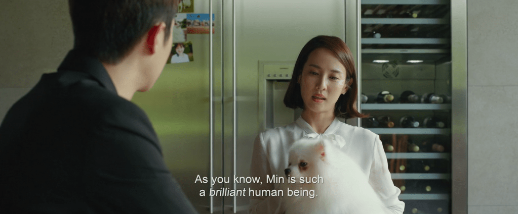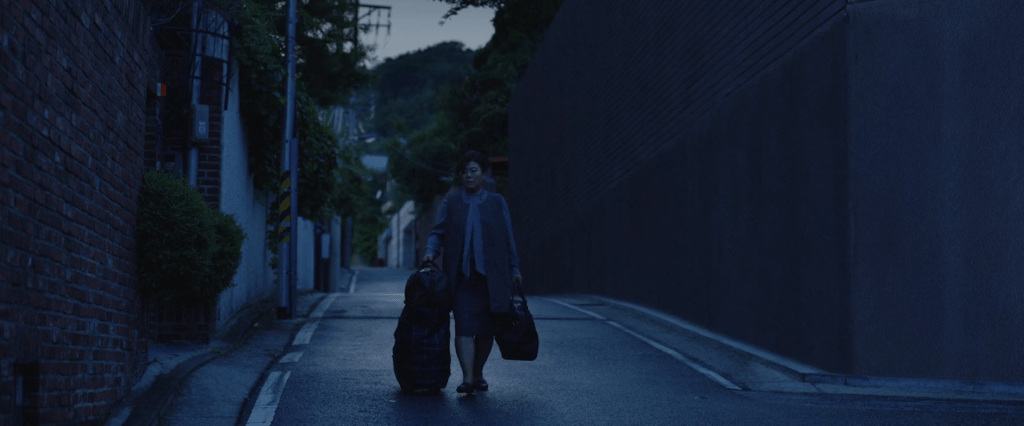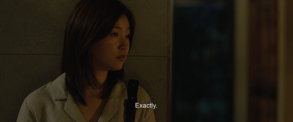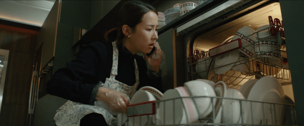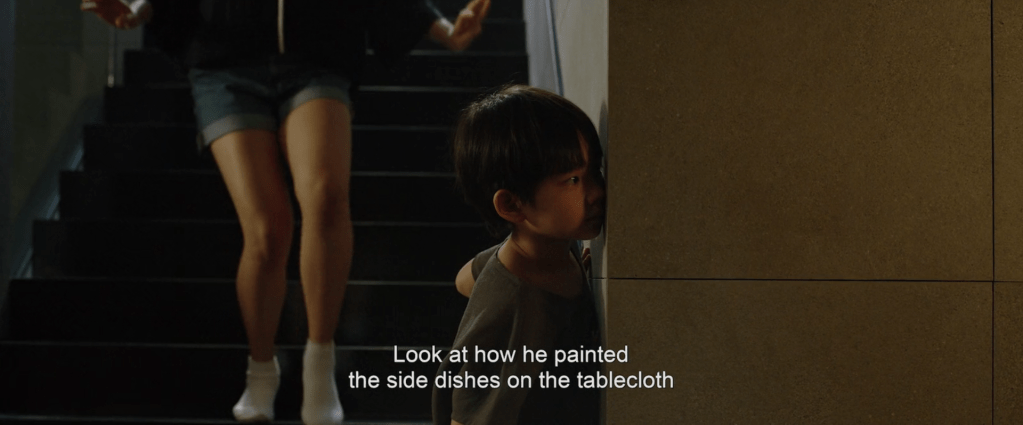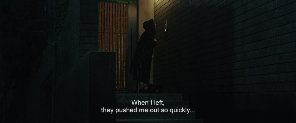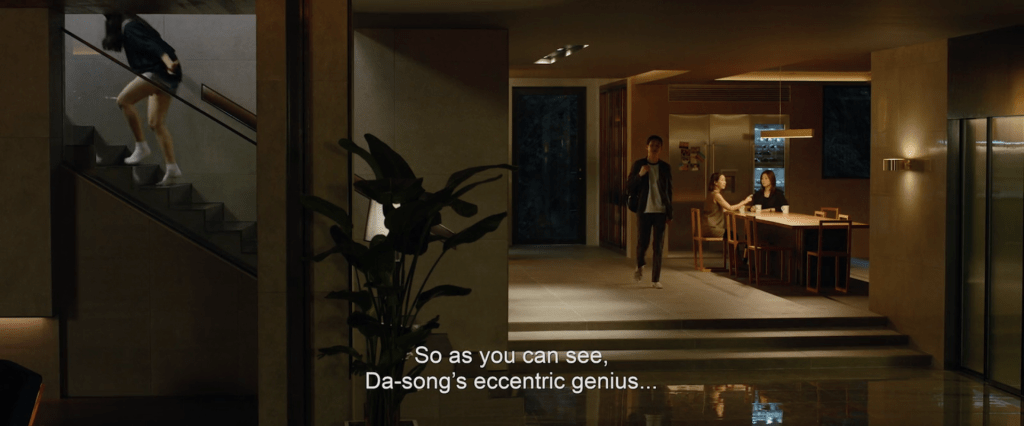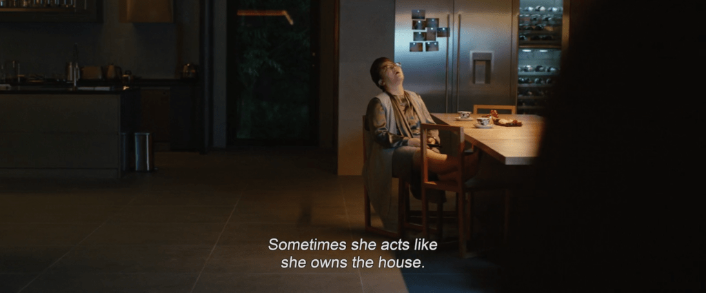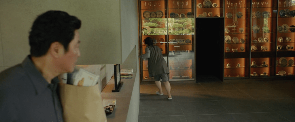 Chung-sook becomes an object within the threshold of her home, a woman and mother commodified by the wealthy and her own family as a way for them to escape from domestic labor themselves. Miranda Brady emphasizes that the delegitimization of motherhood as a profession deserving of a wage, a critique shared with the second wave of feminism, stems from capitalist structures which value laborers in industry over laborers who sustain human life[2], in this example mothers. Chung-sook and her family are victims of capitalist structures and the patriarchal ideology embedded within them. To support themselves financially, they seek employment outside of their home as domestic laborers for the Park family, but because of the devaluation of housework as a legitimate line of work, the Kims are unable to escape poverty and domestic labor at home, all of which is symbolized by the architectural framing of their bodies as imprisoned and constricted within the domestic realm.